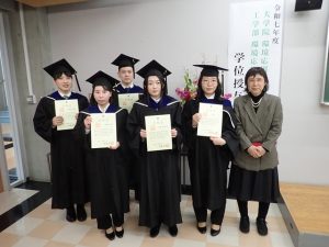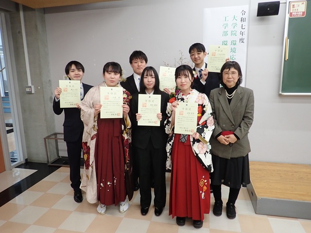 明け方から雪が降りだし小やみになりましたが、あいにくの天気の中、博士1名、修士3名と学士7名が研究室より旅立ちました。博士は社会人学生、修士の学生は社会人としての心構えも指導いただきました。修士の学生は論文執筆や企業との共同研究など多くのことを体験できました。学士の学生は4名は来年度大学院に進学して学びを深めます。研究室で学んだことを活かして活躍してくれることを祈念します。